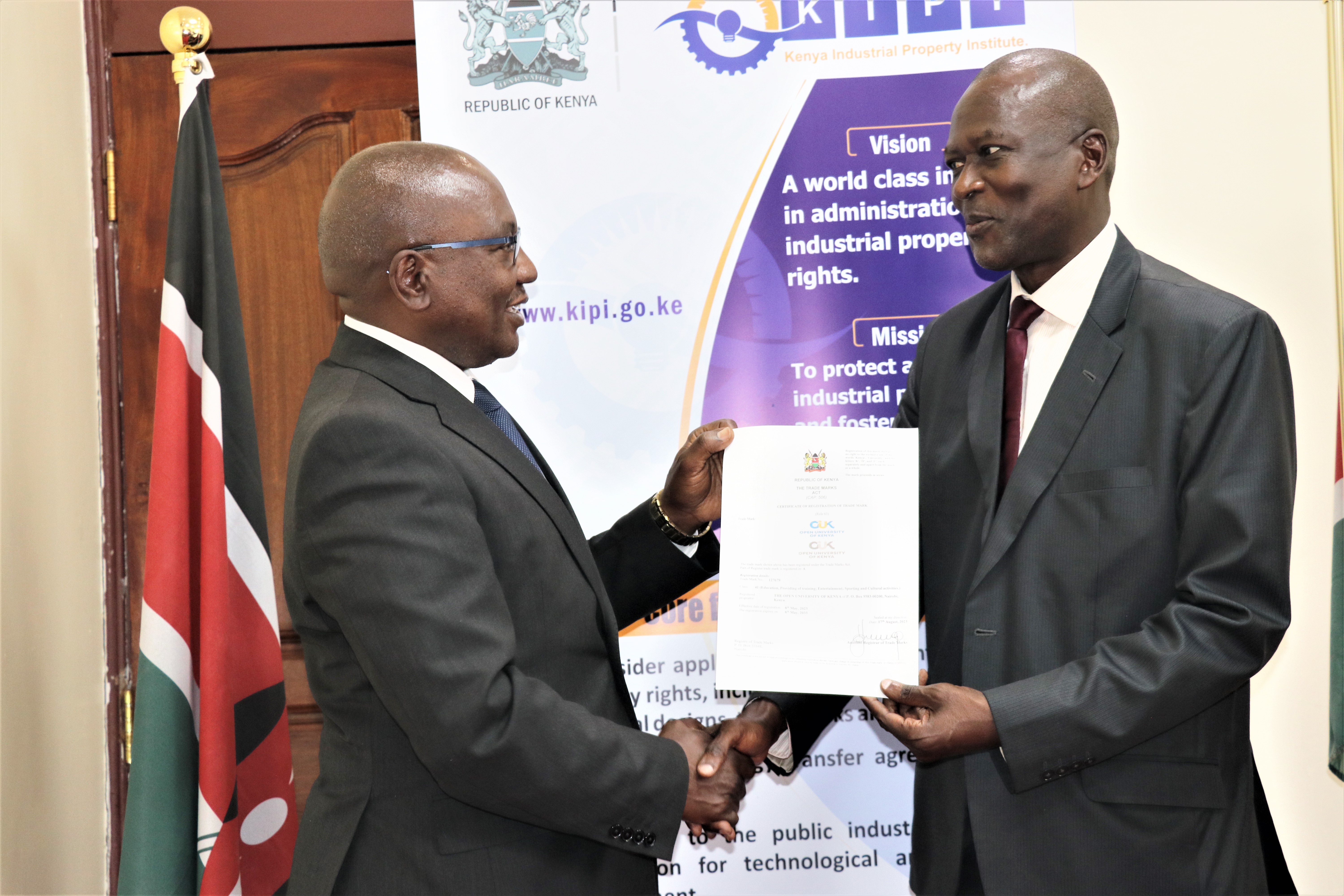 1 and 2 . John Onyango (Centre), the Institute's Managing Director, presents a trade mark certificate of Open University Of Kenya (OUK) to Prof. Elijah Omwenga, the University's Vice Chancellor, at the Institute's KIPI Centre offices. Also in the picture is Janet Kisio, Manager, Institute's Trade Mark Division.